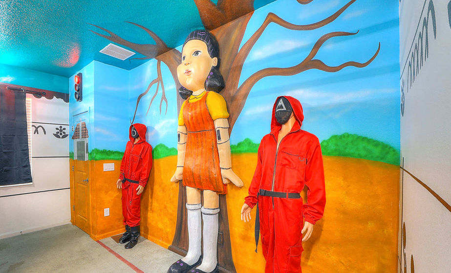 Description This extraordinary experience is truly beyond description. This remarkable mansion, featuring 15 bedrooms each with an attached private bathroom, has gained immense popularity on social media, amassing millions of views & likes. The television-themed mansion offers all the amenities necessary for an unforgettable vacation. Among its luxurious features are a private pool & spa adjacent to the lake, a pirate-themed movie theater that seats 24 guests, a designated selfie area, and a billiard table The Space Huxley Hospitality is pleased to announce the opening of our newest flagship property. This stunning residence is designed to captivate and delight guests of all ages. We invite you to experience an unforgettable journey in this unique treasure, crafted for the ultimate retreat. Featuring 15 luxurious suites inspired by our most cherished television series, this Emmy house resembles a theme park in its own right. While there is something for everyone, please note that not all rooms are suitable for younger audiences. This magnificent mansion is perfect for accommodating large groups, family reunions, corporate gatherings, social media productions, team-building workshops, and sports teams. It comfortably accommodates up to 39 guests. Situated in the exclusive Veranda Palms community, this dream vacation home is ideally located in Kissimmee, just a short drive from Disney World and its various parks, SeaWorld, Universal Studios, premium outlets, and a wide array of dining, shopping, and department store options, all within a 15-minute drive. Additionally, Sam's Club is conveniently located within a mile of the property. The 15 nominations and final winners are, please check our floor plans for layout: MAIN LEVEL 1) Mandalorian 2) Squid Game (TV-MA) 3) Game of Thrones 4) Buffy the Vampire Slayer (PG13) 5) Rick and Morty SECOND LEVEL 6) Mickey Mouse Clubhouse 7) Ugly Betty 8) Cocomelon 9) Naruto 10) Stranger Things (TV-14) 11) Breaking Bad 12) Spongebob Squarepants 13) Teen Titans 14) Peppa Pig 15) The Simpsons Come and start making memories in this modern, and massive upscale mansion. This villa features: *15 all TV themed suites bedrooms. *15 full en-suite bathrooms plus 2 additional half baths. *5 bedrooms suites on main level and 10 bedroom suites on second level. *Movie theater for up to 24 guests in air conditioned garage. Bring your own DVD or rent from Redbox. *Central Perk coffee shop themed open living room with dual(2) 85" Smart 4K TVs, stage, pub tables, tables and kitchen island with seating for over 30 people. Get your smelly cat singing contest on with the stage complete with Bluetooth karaoke, keyboard and acoustic guitar. *8 feet slate pool billiard table. *Large fully equipped kitchen with 2 sets of refrigerators, 2 freezers, 2 dishwashers, 5 burner stove & oven with center island with 9 stools. *Loft will be lots of fun in our selfie booth world with 5 different illusion photo booths with proper stage lighting. Action! *Relaxing lakeside pool with spa, lounge chairs, kid's play section, ample seating, dining tables with 12 chairs, sectional, propane grill, with a large poolside 120" movie screen. Pool and patio screened in with mesh enclosure. Get ready for an adventure through 15 of our TV shows and feel like you're a cast member on the set with in this custom designed home. Family and friends will love to stay in this one of a kind mansion. MAIN LEVEL: TV SHOW: FRIENDS *Gather around the spacious main living space with two living room sets and 2 smart 85" TV, PS4 system (Bring your own games & controllers) *Oversized kitchen with upgraded Samsung appliances including 2 fridges & 2 freezers, 2 dishwashers, stove & oven,2 washers & dryers, fully equipped with dinnerware, silverware and cookware for up to 36 people *Large kitchen island with 9 counter stools *5 bedroom suites with it's own bathrooms on main level (Mandalorian, Squid game, Game of thrones, Buffy the vampire slayer, Rick & Morty. *1 half bathroom in hallway by pool door. *Sliding patio doors and door to back patio and pool complete with outdoor shower. *Enclosed screened in pool and spa *4 sun loungers, patio dining for 12 guests, sectional seating up to 7 guests with propane firepit (fill gas as needed by guests), kids play area with kids sun loungers. *Lots of fun outside games for kids and guests to keep everyone entertained. GARAGE: TV SHOW: ONCE UPON A TIME *3 car garage converted to premium air-conditioned 24 seats pirate ship movie theater. SECOND LEVEL: *5 Illusion photo booths. Be the star in your own photo shoot. *Several Multi-cade arcade games with over 1000 classic all time favorites on each machine, multi-games pinball machine. *10 bedrooms complete with 10 full bathroom suites in every bedroom. *Half bathroom in hallway. TV SHOWS: BR1: MANDALORIAN: The force is strong in this bounty hunter room. On the set of Tattoine, unwind in this thrilling bazaar market featuring king size suite complete with a plush Stearns & Foster mattres as found in Ritz Carlton hotels, LED Smart TV, dresser. Themed master bathroom suite complete with dual marble sinks, glass shower, walk-in closet and toilet closet. Location: Main level Bed size: king bed BR2: SQUID GAME: Not for the weak hearted. Want to play in this room where contestants fight to win the jackpot and get to live in this immersive red light, green light room. There will be 6 final contestants with 6 twin beds. The room is monitored by a 9 foot AI doll and 2 pink soldiers 24 hours a day. Themed ensuite master bathroom with dual marble sinks, glass shower, walk in closet. Location: Main level Bed size: 6 Twin beds BR3: GAME OF THRONES: Bend the knee in this majestic classic featuring the iron throne joined by Daenerys and Jon Snow. Lavish the life of a king sleeping in the Red keep on a bed of fur with Stearns & Fosters mattress, 55" smart TV, 2 nightstands, dresser. Location: Main level Bed size: King mattress BR4: BUFFY THE VAMPIRE SLAYER